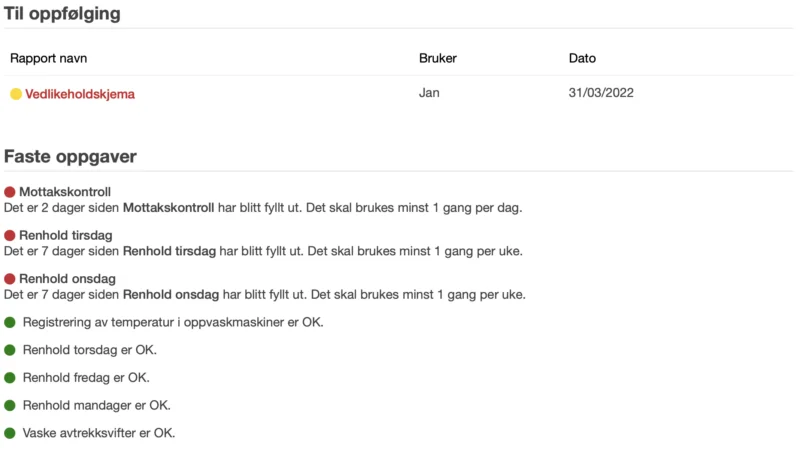 Alle faste oppgaver kan legges inn med hvor ofte de skal følges opp. Egenkontroll holder rede på når oppgavene skal fylles ut og om de er fulgt opp. Oppgaver som ikke er fulgt opp kan varsles med push-melding. Det samme gjelder for avvik- eller vedlikeholdsoppgaver som er lagt inn løpende. Dersom oppgavene ikke blir fulgt opp så varsles de både gjennnom app eller som push-meldinger.