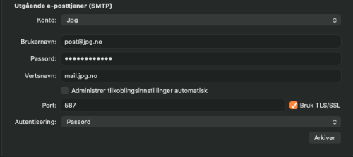 På utgående eposttjener (IMAP) skal også brukernavnet ditt være hele emailadressen. Legg deretter inn passordet du har fått tilsendt eller satt selv. Vertsnavn eller servernavn er mail.jpg.no. Port skal også her defineres og porten på utgående eposttjener er 587. Hvis den er satt automatisk så må du overstyre den. SIkkerhetsnivå må også her settes til TLS/SSL. Autentisering er passord. Oppsettet er ferdig og trykk deretter lagre eller arkiver.